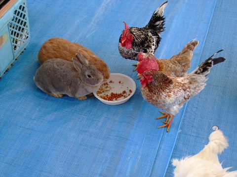 ウサギとチャボが仲良く食事♪