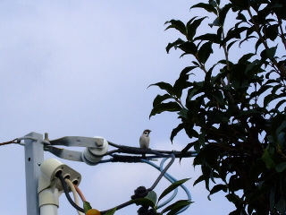 電線のスズメです。うちにはキジバトやメジロも来るんですけど、なかなか撮れない…。
