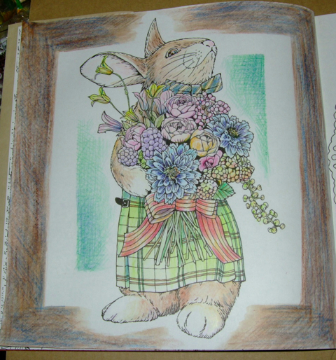 普通の色鉛筆 &クーピーで彩色。花を束ねてるリボンの