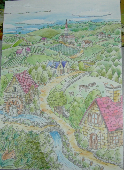 空と川・道のそれぞれ一部にパステルを使ってます。